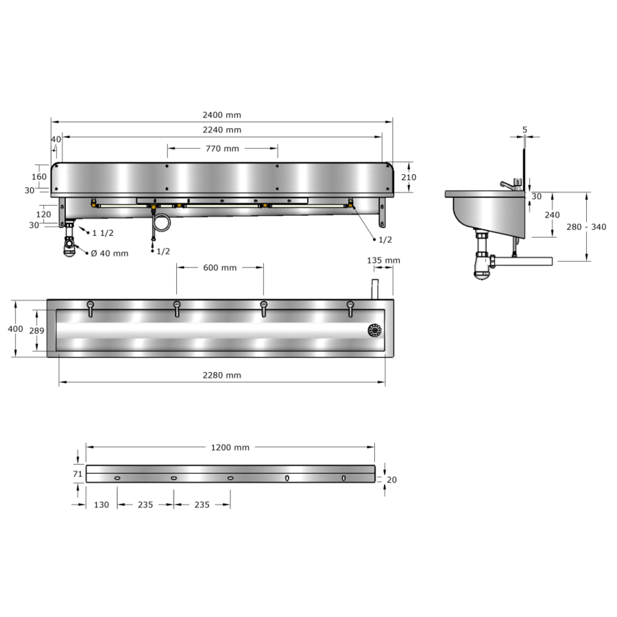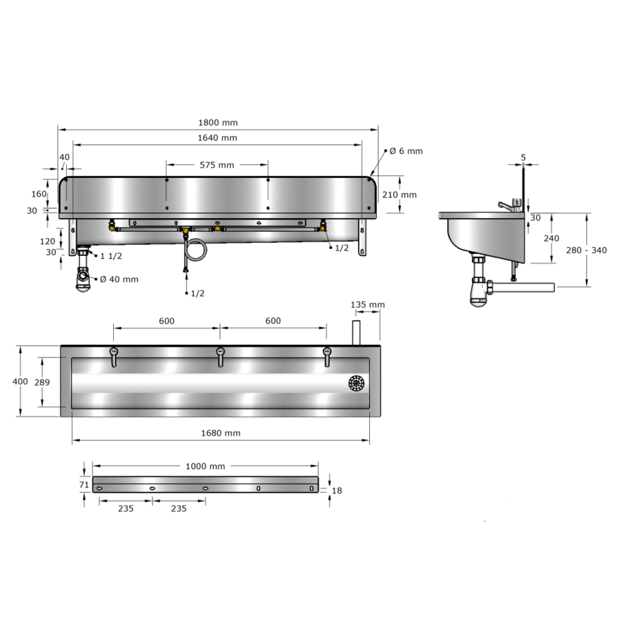 Waschtisch mit Spritzschutz, zur Wandmontage, mit integrierten Wandhalterungen und Kranstange. Inkl. Wasserhähne. Nach rechts abfallender, flacher Boden. Rinnenwände abgerundet mit verschweißter Seite.