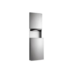 Stainless steel towel dispenser with integrated waste bin (56.8 l), suitable for 600-800 towels. Built-in model with flat cylinder lock, satin finish and removable waste bin. Available in surface-mounted version. Price varies per model.