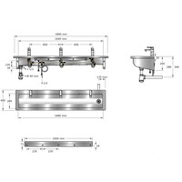 Washing trough without backsplash, for wall mounting, with integrated wall brackets and crane beam incl. taps. Flat bottom sloping to the right. Trough walls rounded with welded-on side.
