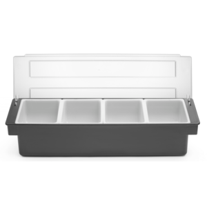 Support HIPS noir avec couvercle ABS transparent. Avec 4 conteneurs en polypropylène. Les conteneurs peuvent être facilement retirés du support. Les contenants vont au lave-vaisselle.