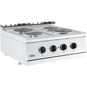 La table de cuisson électrique à quatre foyers (2 x 2,25 kW et 2 x 1,85 kW) assure une chauffe rapide et homogène. Le modèle de table en acier inoxydable, mesurant 800 x 700 x 300 mm, est robuste, compact et idéal pour les cuisines professionnelles à fort
