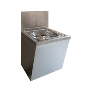 Réservoir d'évacuation des matières fécales. Simple, robuste et hygiénique, idéal pour les hôpitaux. En acier inoxydable AISI 304 avec chasse d'eau à 360°, consommation d'eau de 6 l/chasse, siphon en plastique et supports muraux inclus. Élimination effica
