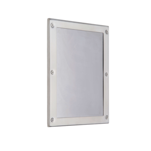 Miroir de sécurité 406 x 305 mm en acier inoxydable (AISI 304) avec cadre brossé sans joint et dos renforcé. Montage depuis les sanitaires. Matériel de montage inclus. Durable, hygiénique et facile d'entretien.