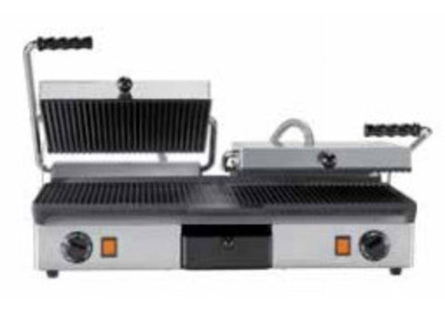 Un gril à double contact. Le côté gauche a un dessus lisse avec un dessous côtelé. Et le côté droit a un haut et un bas côtelés. Réglable jusqu'à 300°C. ATTENTION : LA PHOTO EST DIFFÉRENTE DE CE À QUOI RESSEMBLE LE PRODUIT.