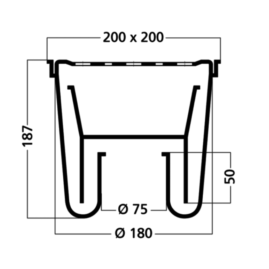 Fosse à godets avec boîtier en ABS et grille en acier inoxydable 200 x 200 mm, capacité de charge jusqu'à 250 kg.