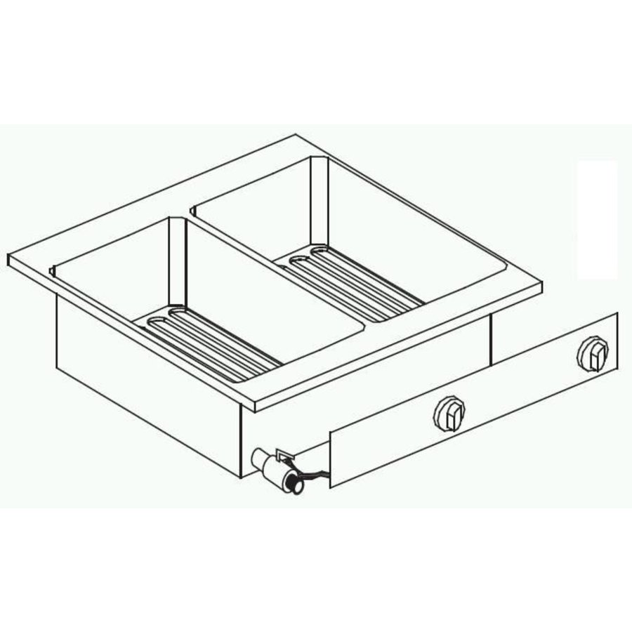 Friteuse électrique avec option double friture. La friteuse a une capacité de 20 litres (2x10L), adaptée à une installation encastrée. Equipé d'un panier, d'un couvercle et d'un robinet de vidange. A une valeur de connexion de 400 volts/11 kW.