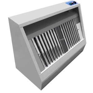 Hotte murale compacte Combisteel en acier inoxydable (1000 x 900 mm) avec moteur intégré, éclairage LED, deux filtres et débit d'extraction de 2000 m³/h. Équipée d'une bonde et d'un régulateur. Idéale pour les petites cuisines professionnelles.