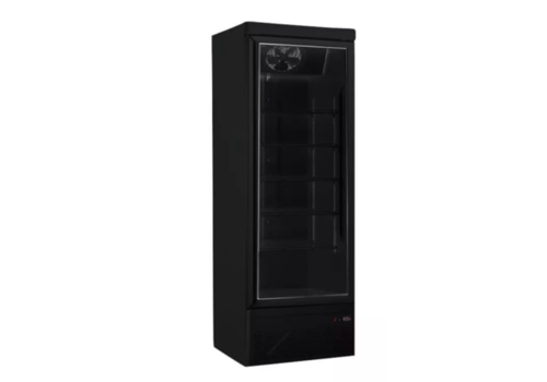 Réfrigérateur étroit avec porte vitrée noire et circulation d'air. Idéal pour conserver et présenter vos boissons.