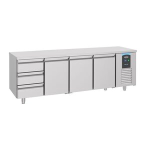 Établi réfrigéré | 3 portes | 3 tiroirs | 233 x 70 x 85 cm | Étiquette A