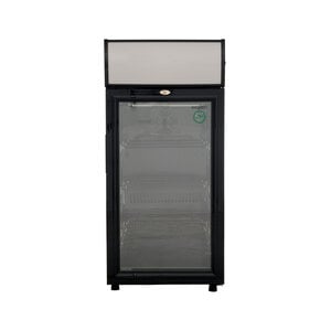 Cette mini vitrine réfrigérée noire offre une capacité nette de 80 litres et est dotée d'un caisson lumineux publicitaire. Équipée d'une serrure et de trois étagères métalliques, elle est idéale pour la vente directe et le stockage sécurisé.